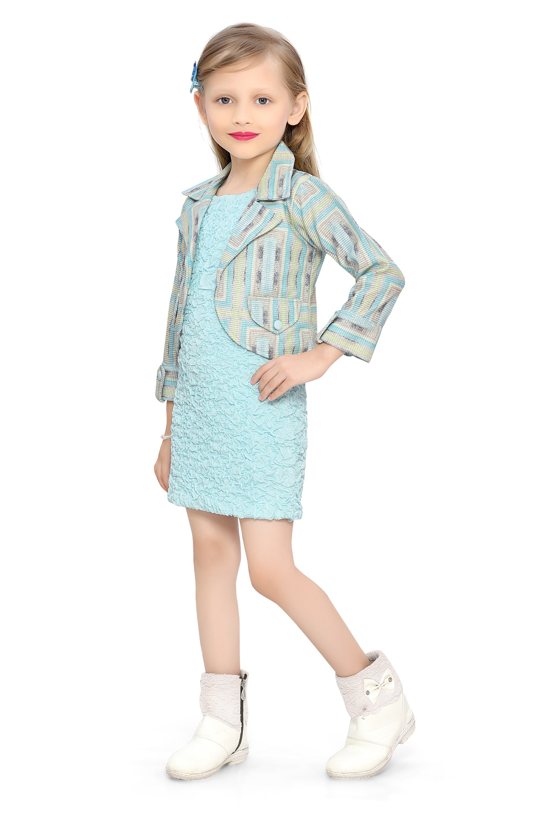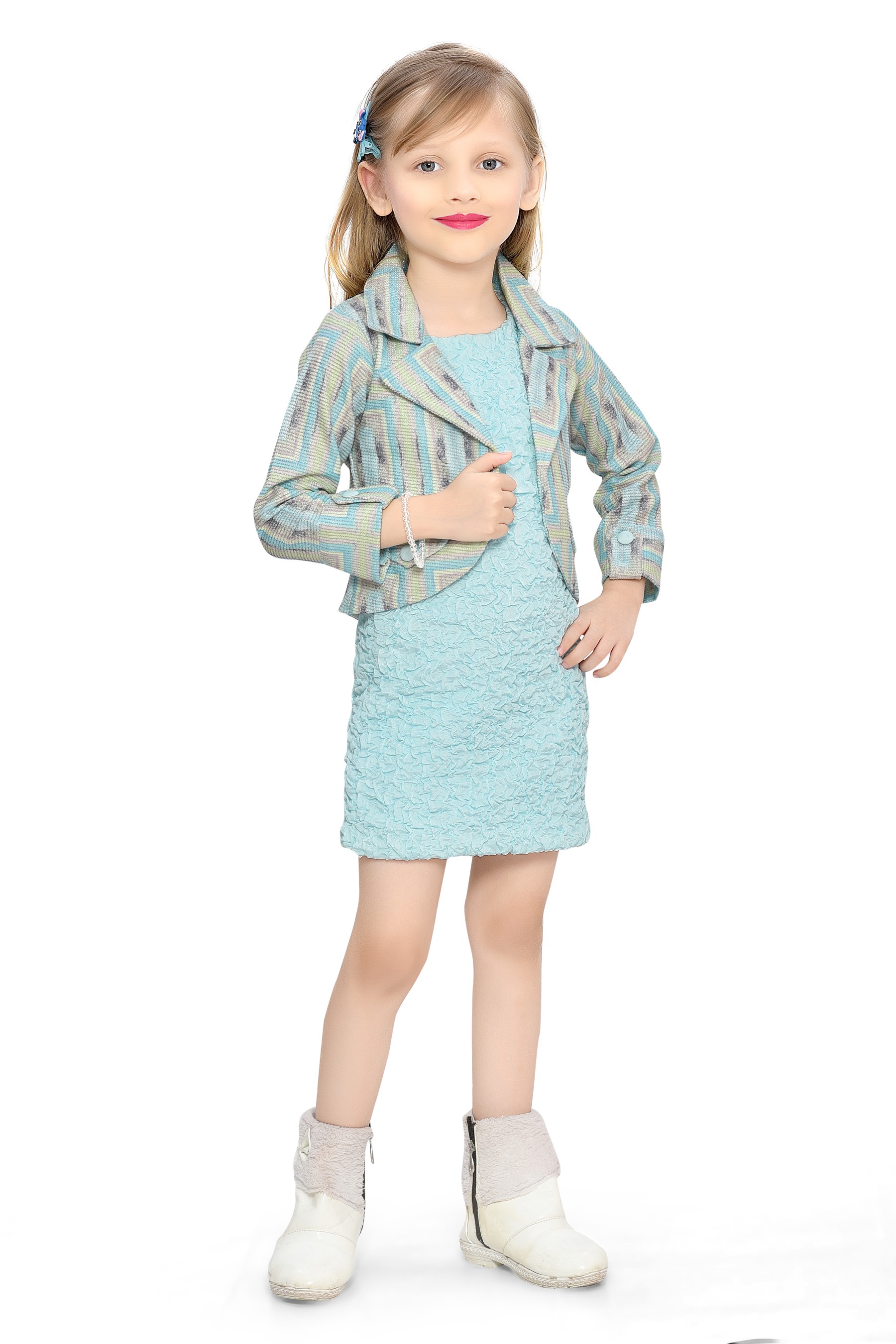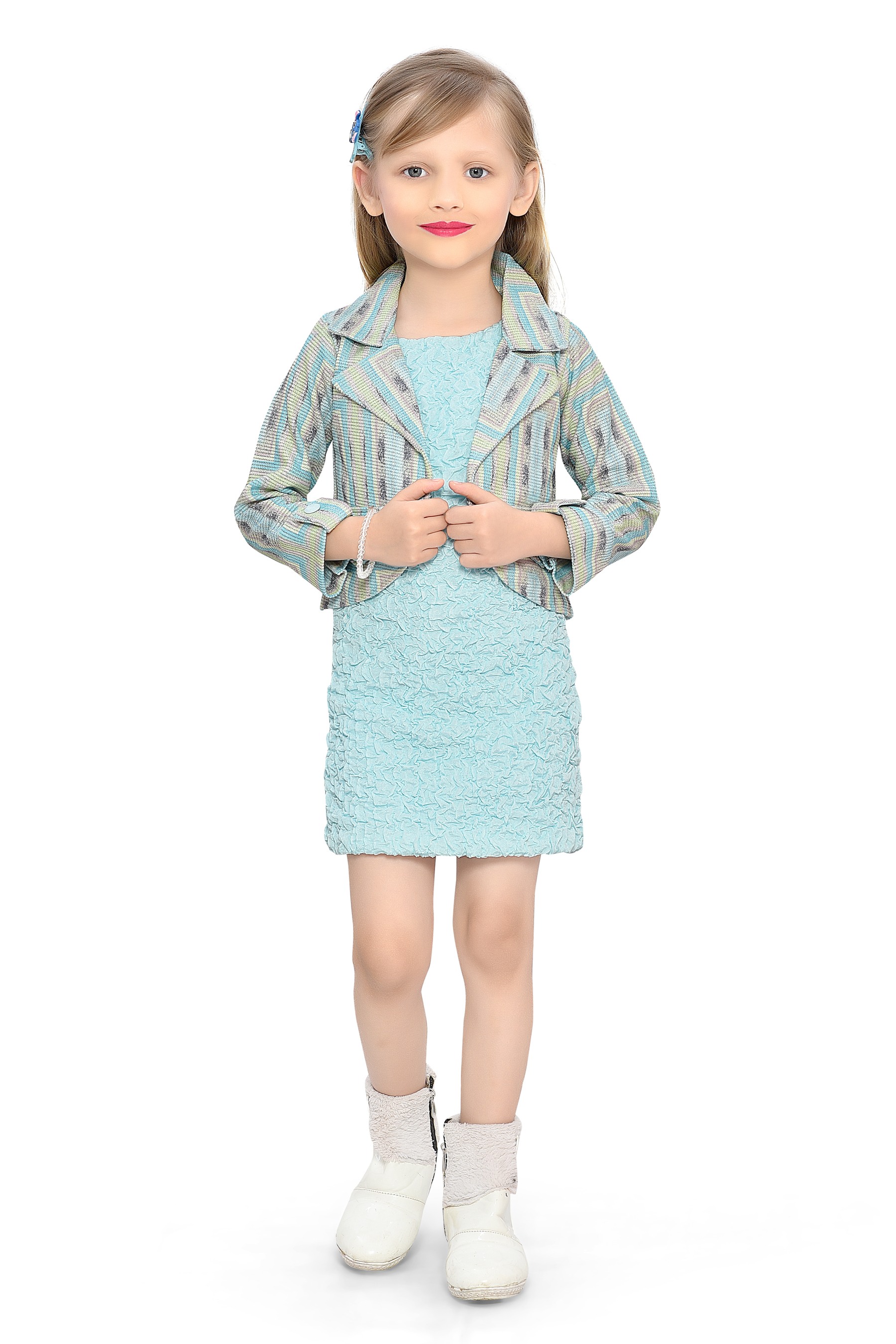 Elevate your little girl's wardrobe with the Be:kids Aqua Elegance Two-Piece Ensemble, featuring a charming textured sleeveless dress in a refreshing aqua hue, paired with a stylish striped blazer. This chic and versatile set is perfect for a variety of occasions, from family gatherings to school concerts.