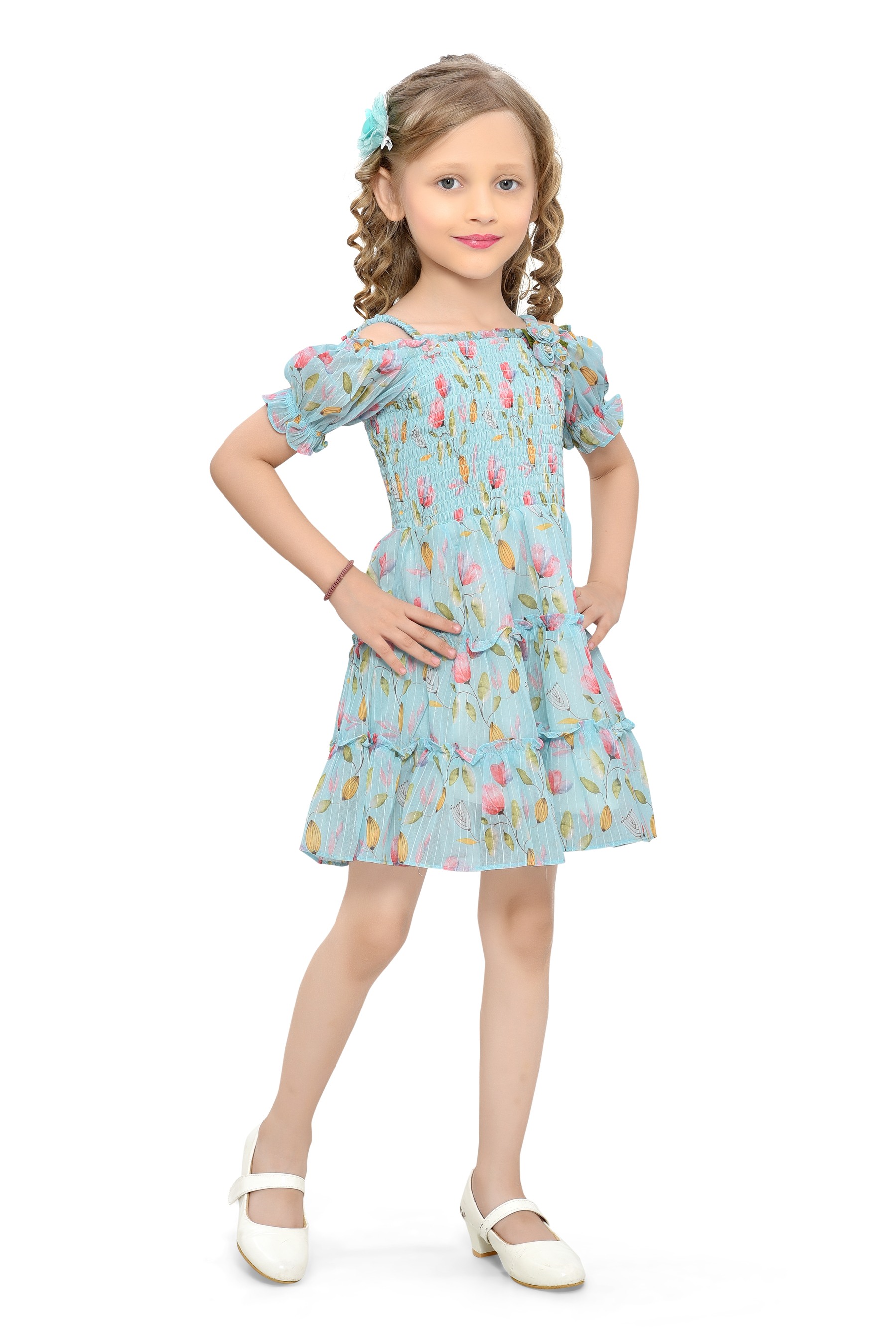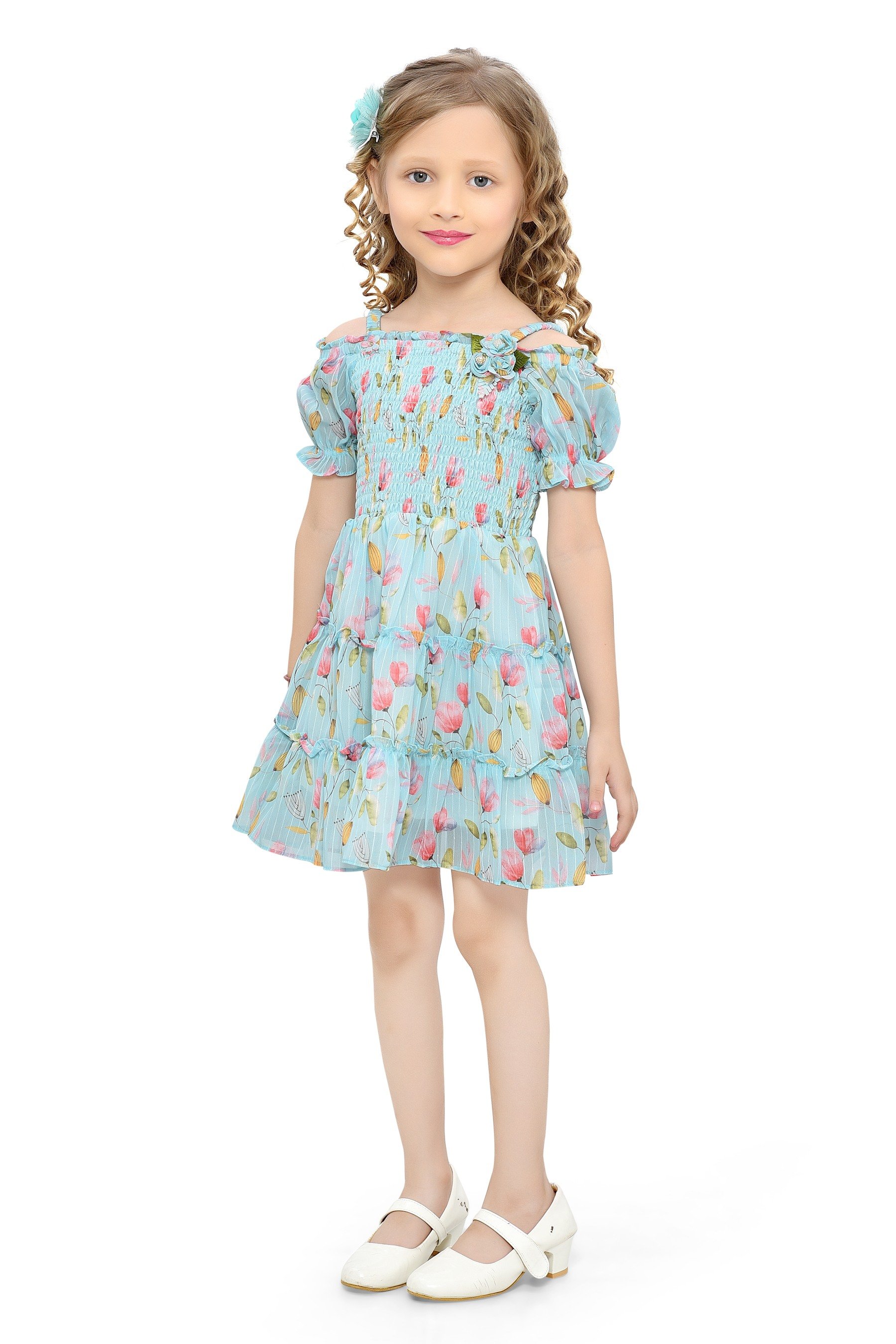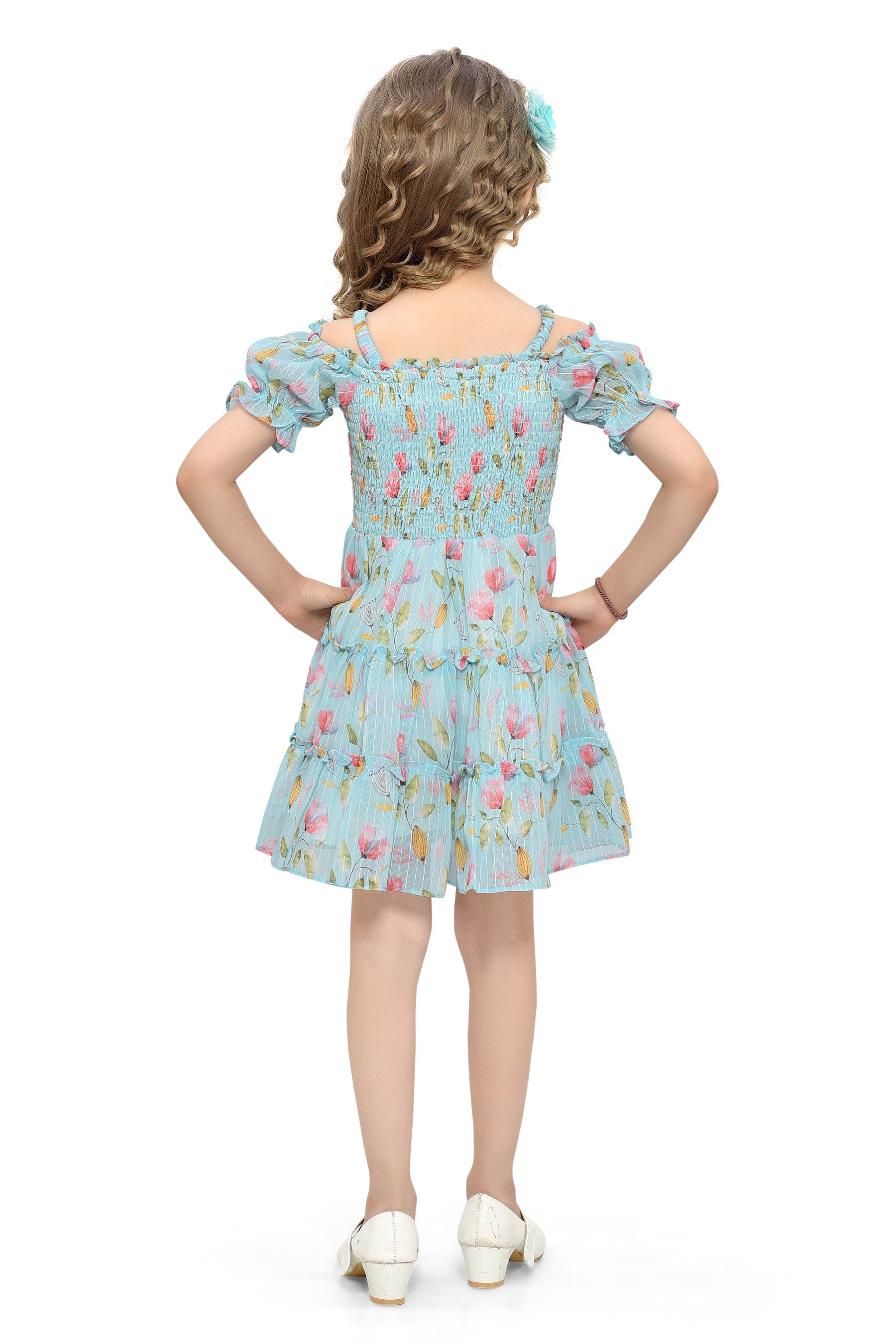The Be:Kids Blossom Bliss Blue Floral Smocked Dress is a must-have for any little girl's spring and summer wardrobe. It's a piece that's sure to make her feel special and look adorable, whether she's attending a birthday party or simply enjoying a day at the park.