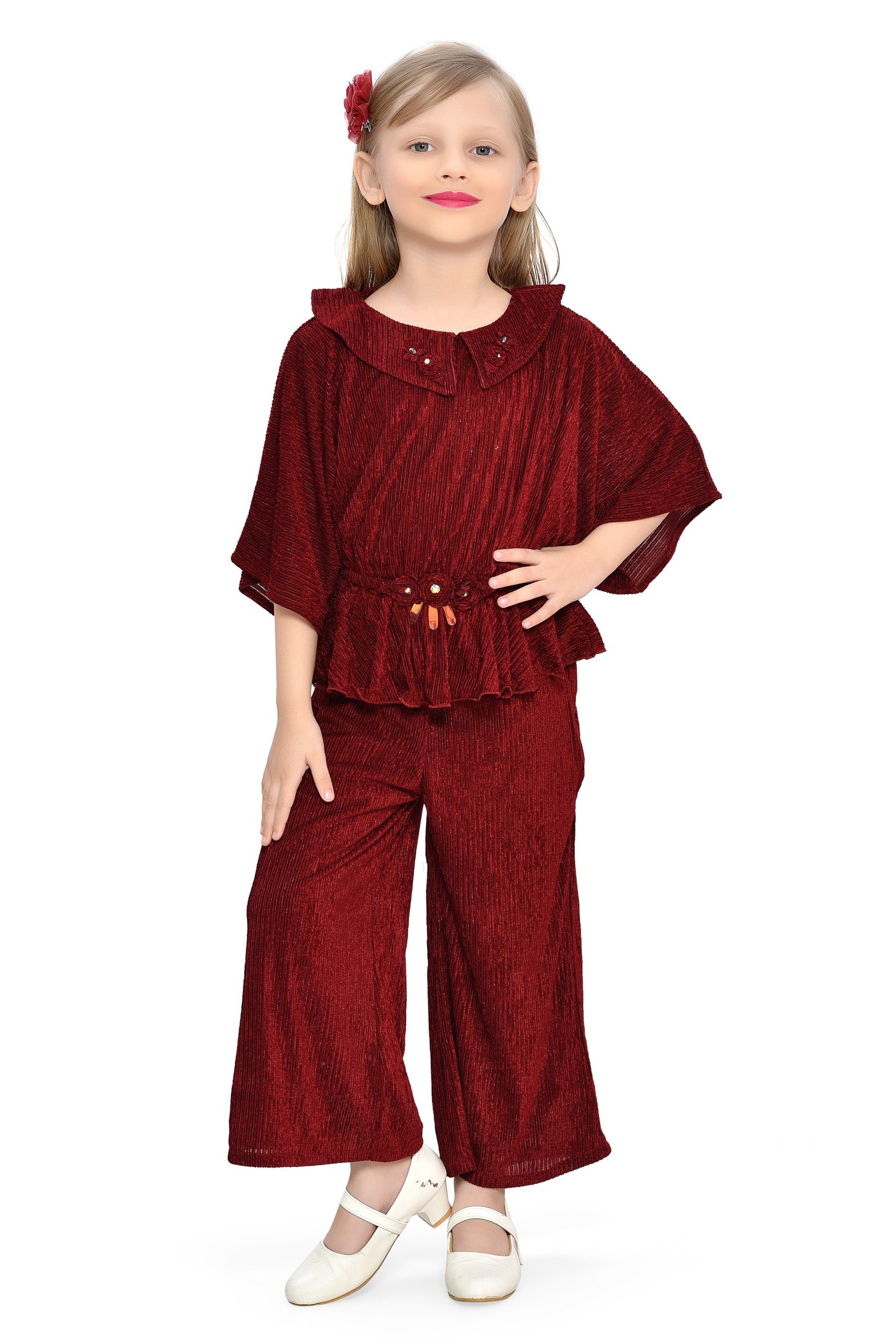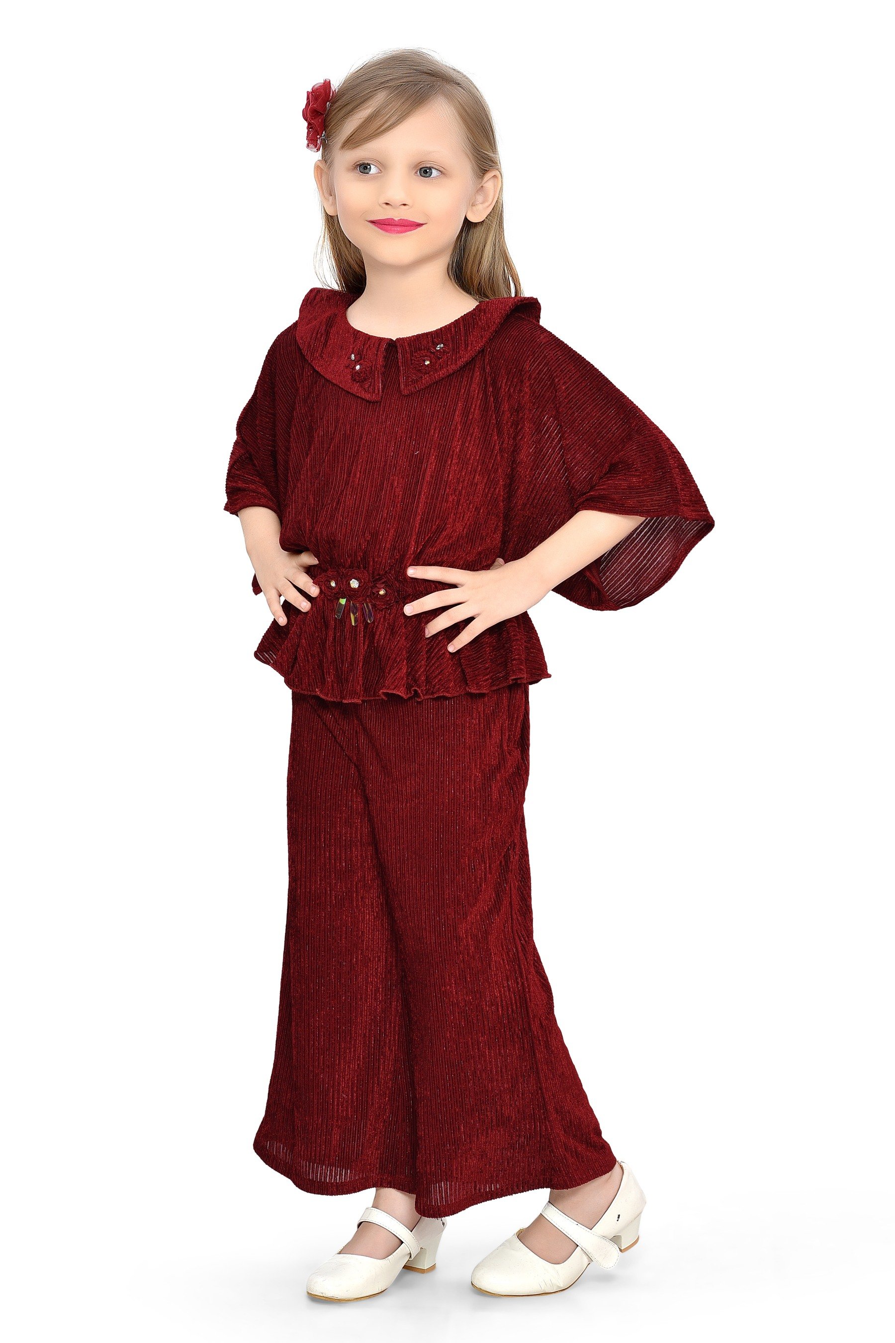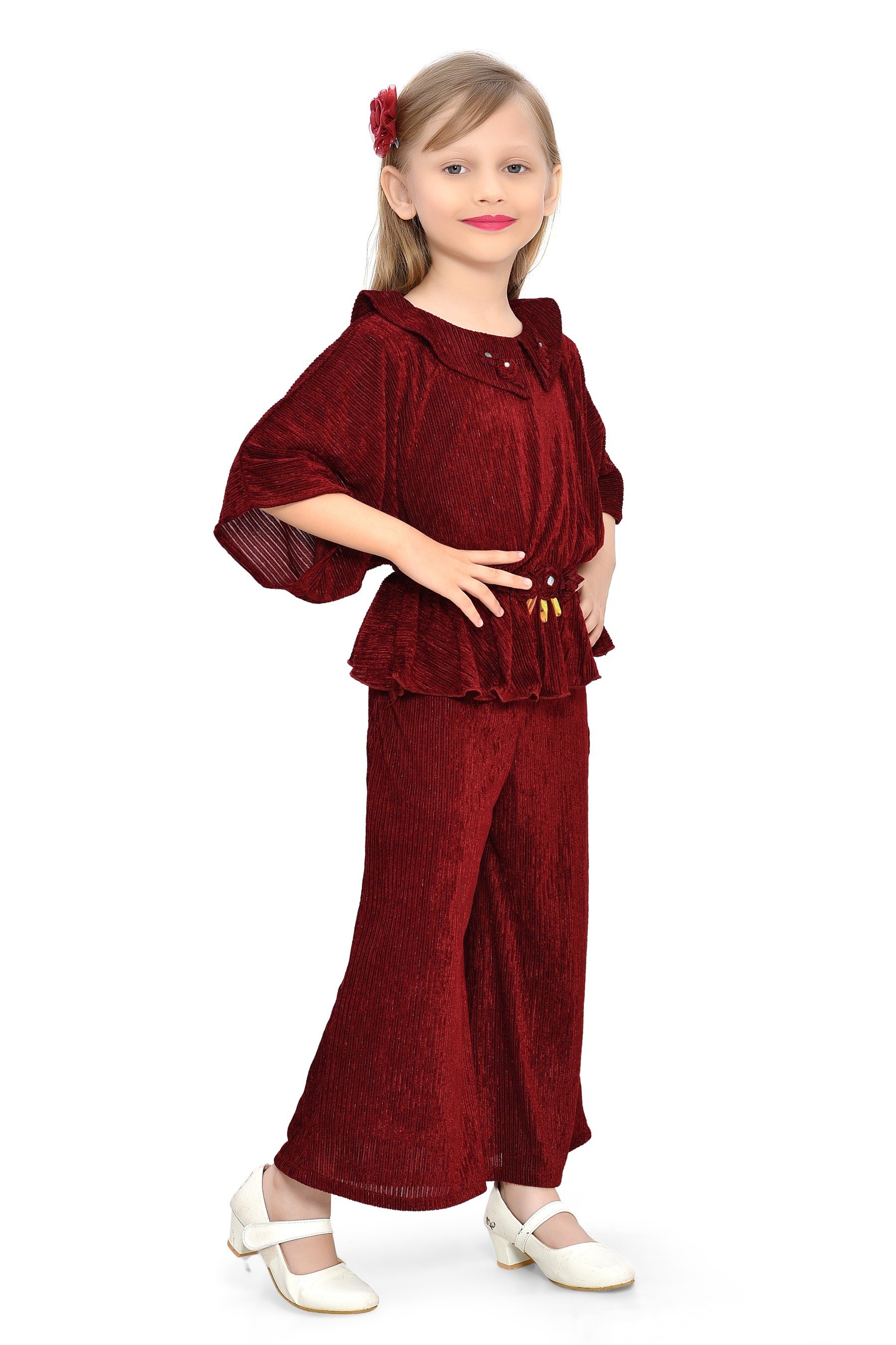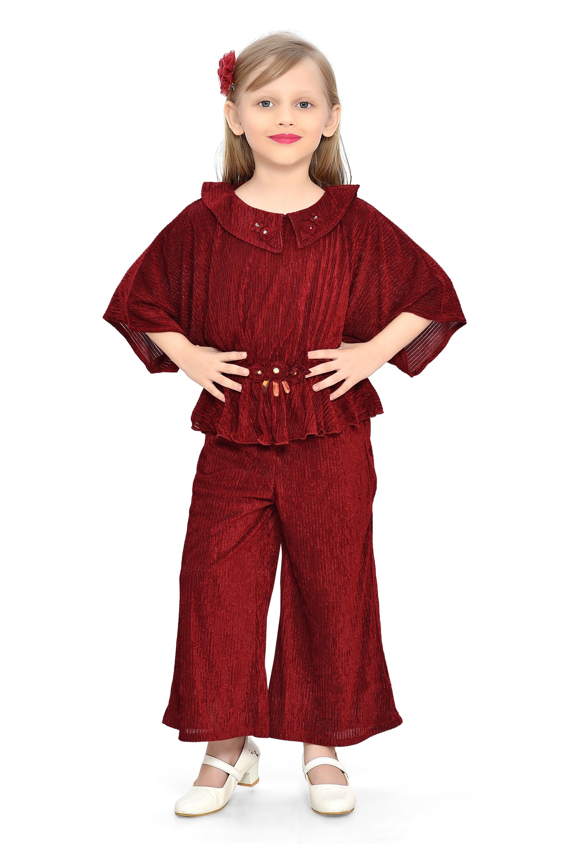 The Be:Kids Burgundy Textured Ruffle Top and Wide-Leg Pants Set is a must-have for any young girl's wardrobe, offering a touch of elegance and a lot of styles.