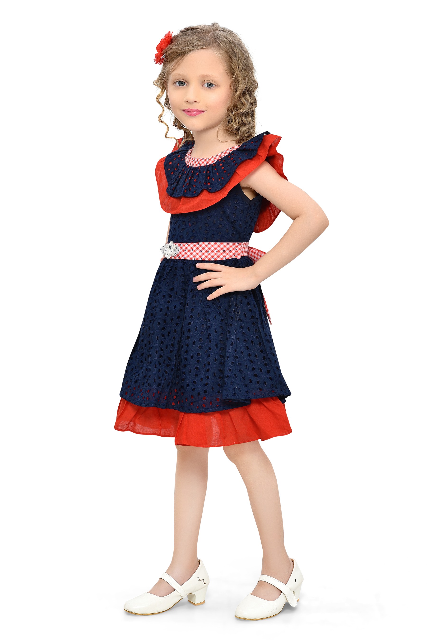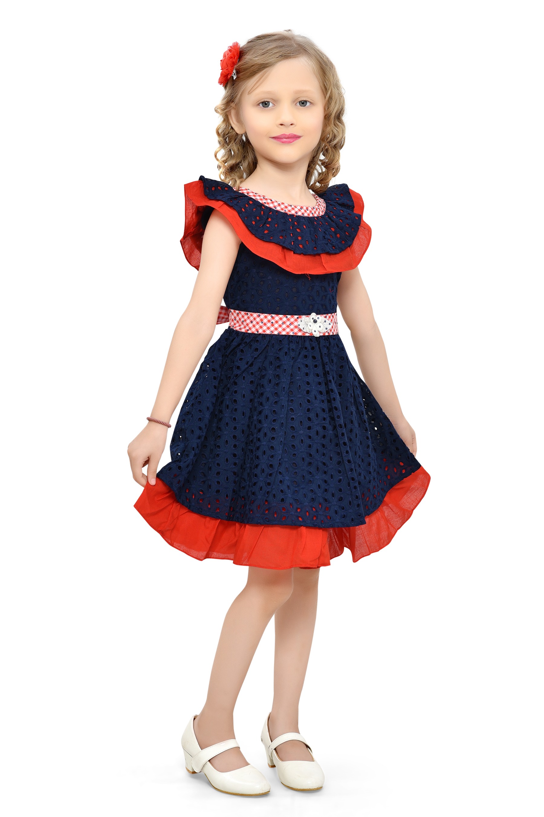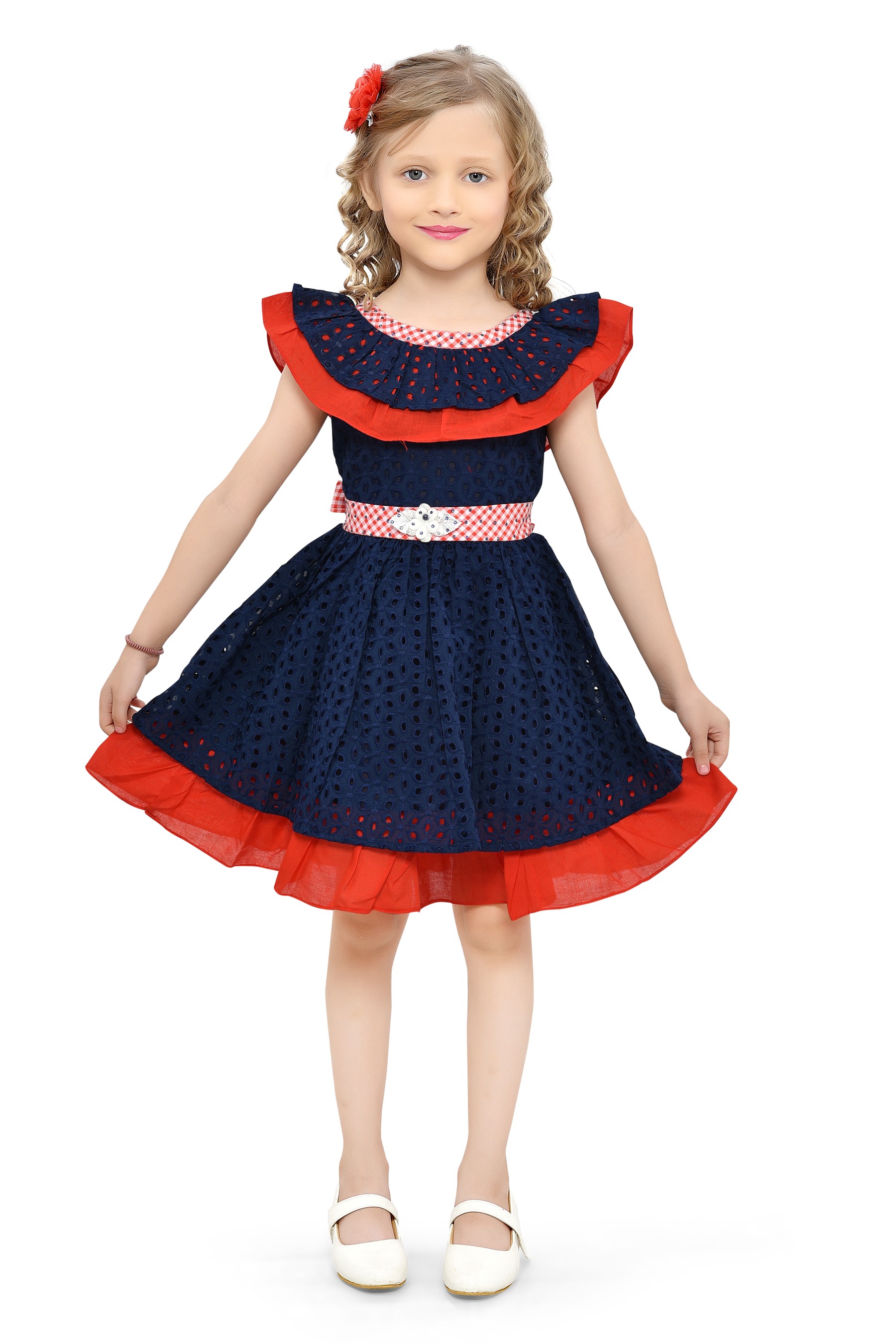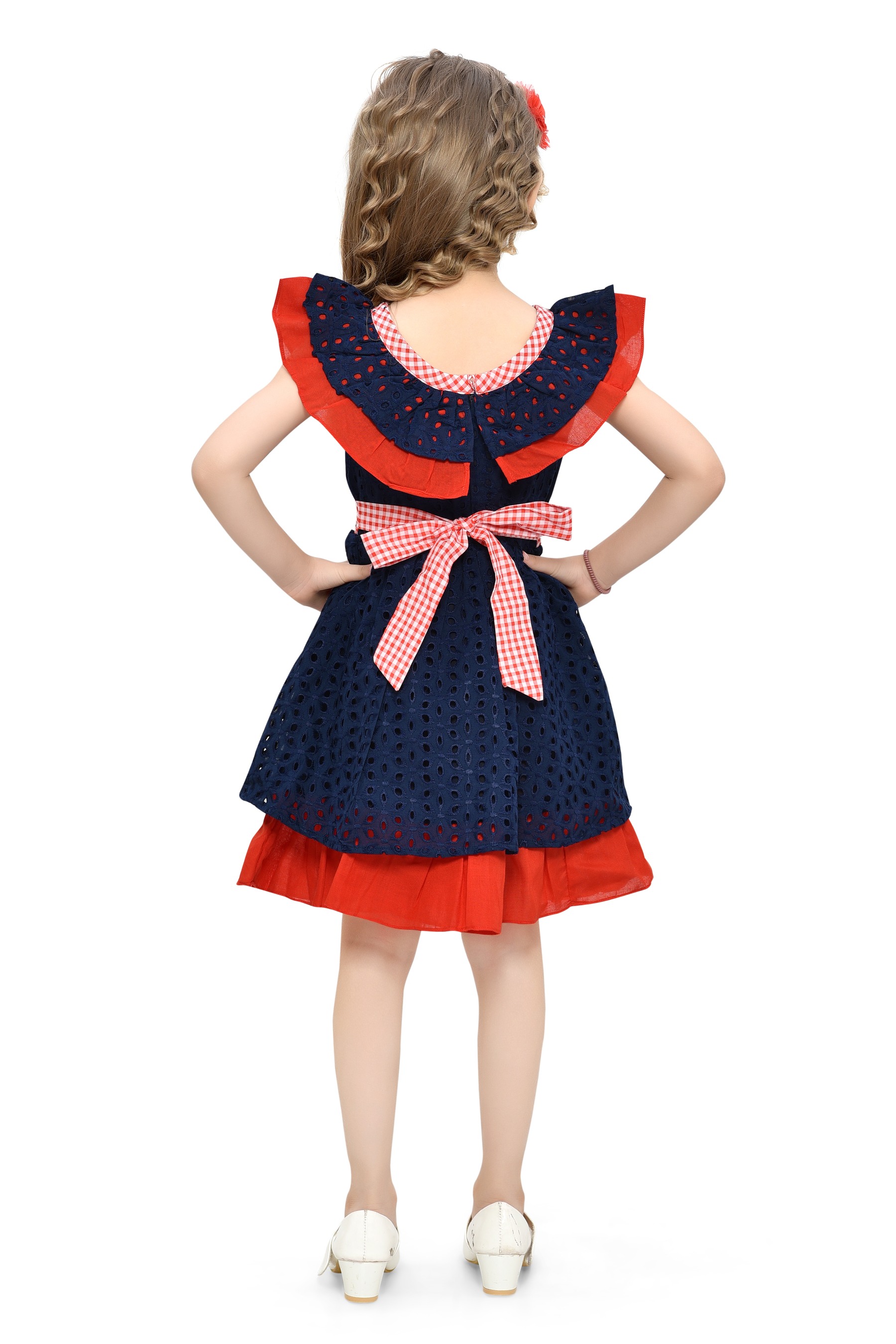 - Red Blue Elegance: Red blue ruffled collar and hemline accents add a touch of timeless grace to the vibrant Navy dress.