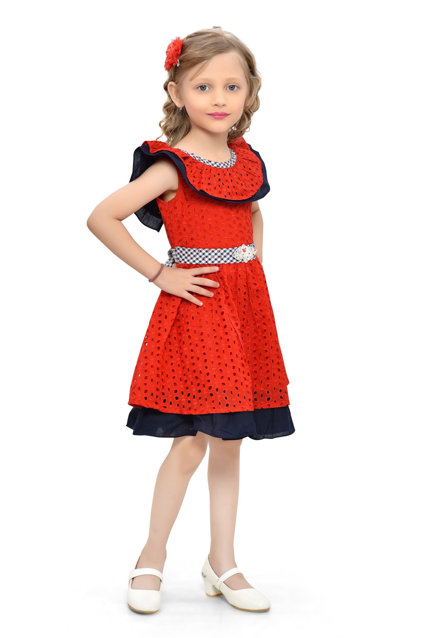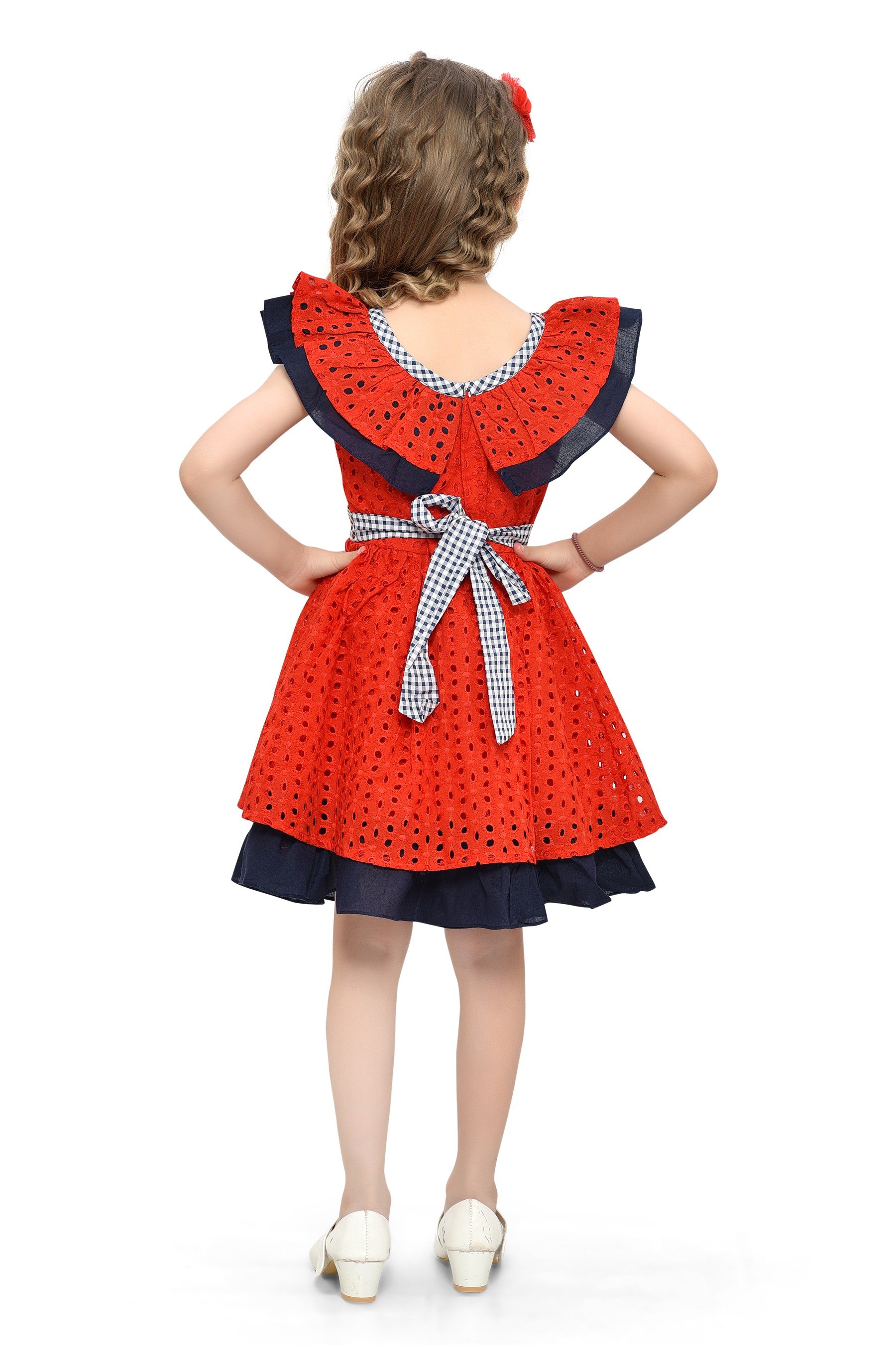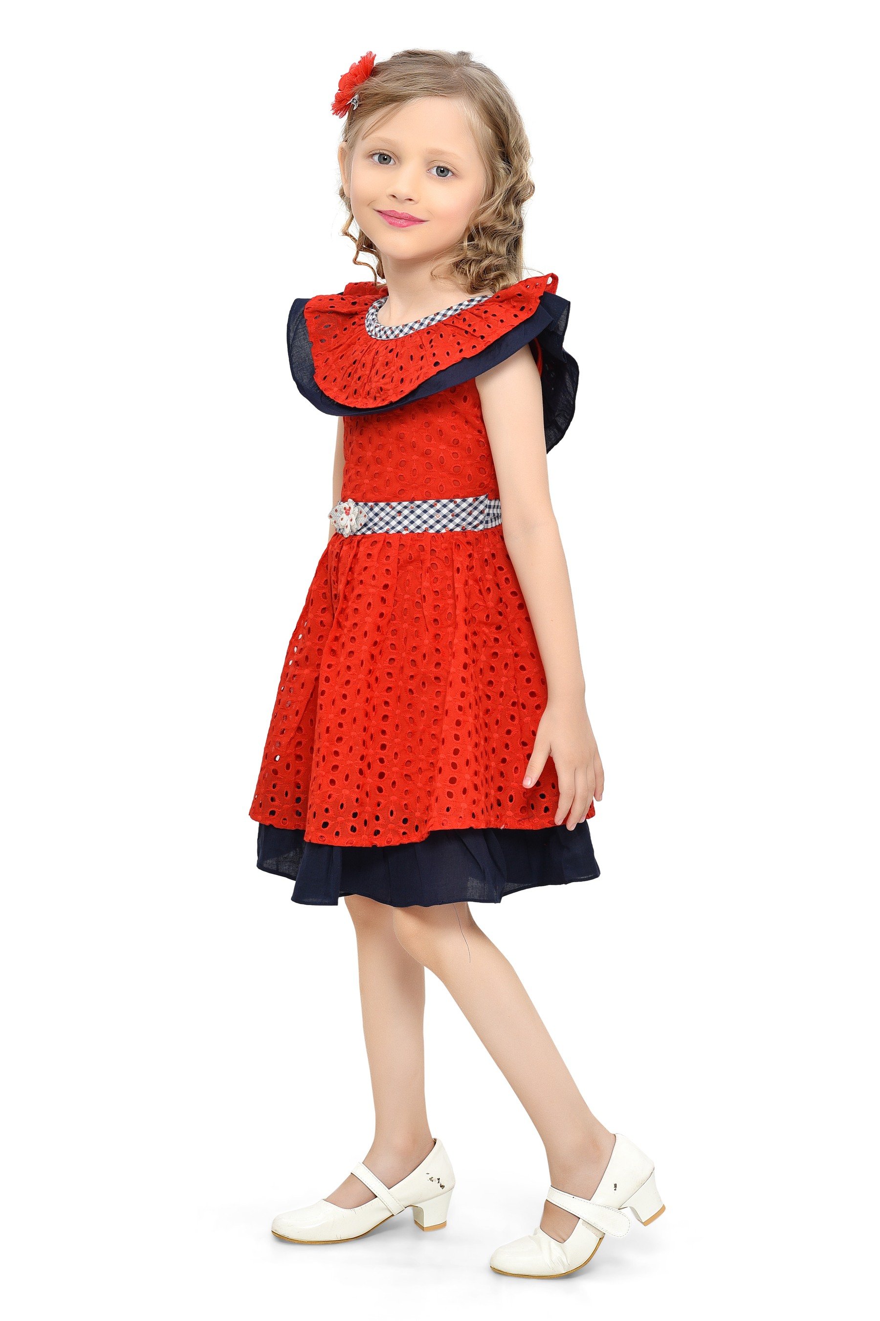 - Navy Blue Elegance: Navy blue ruffled collar and hemline accents add a touch of timeless grace to the vibrant red dress.