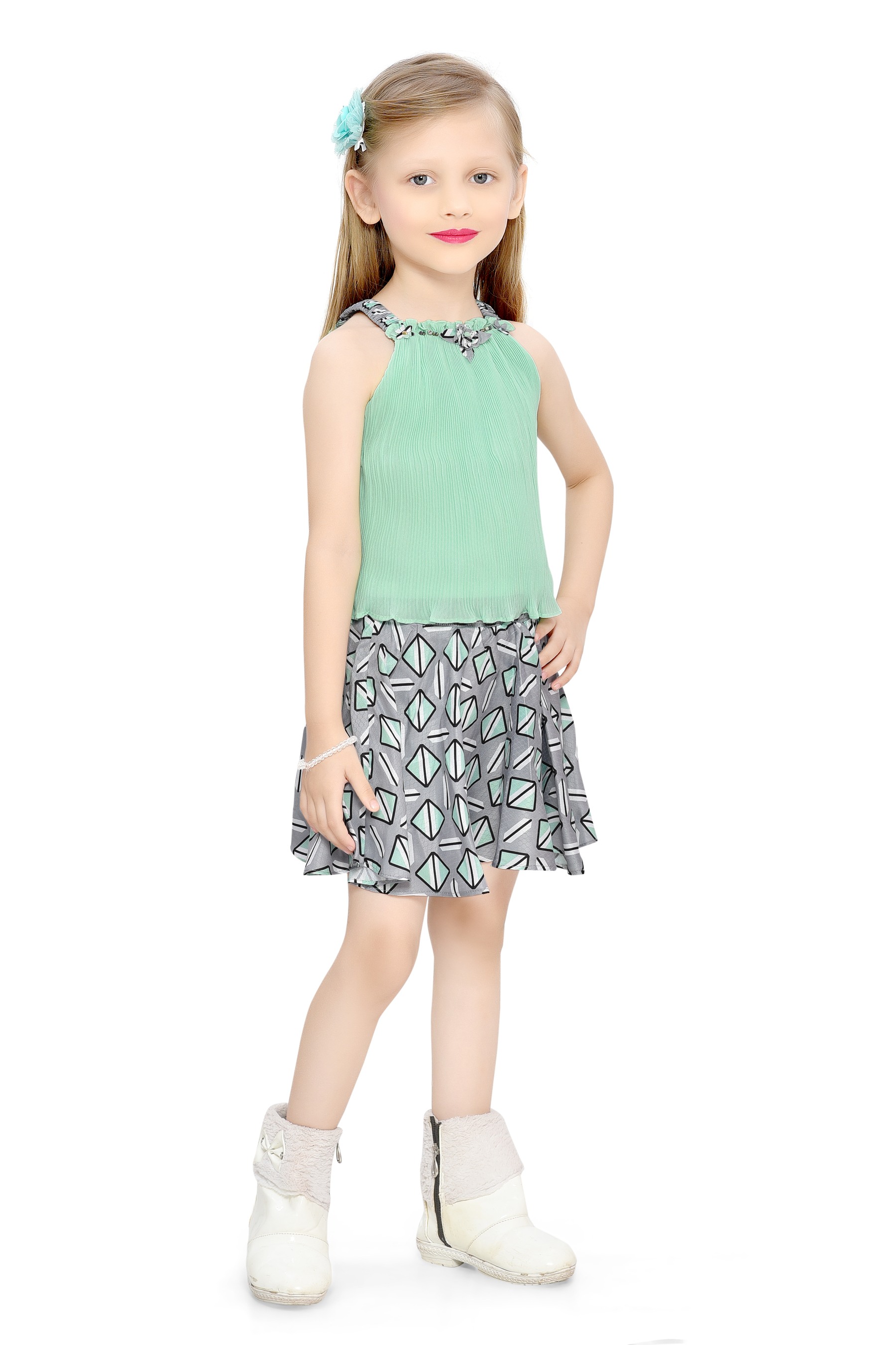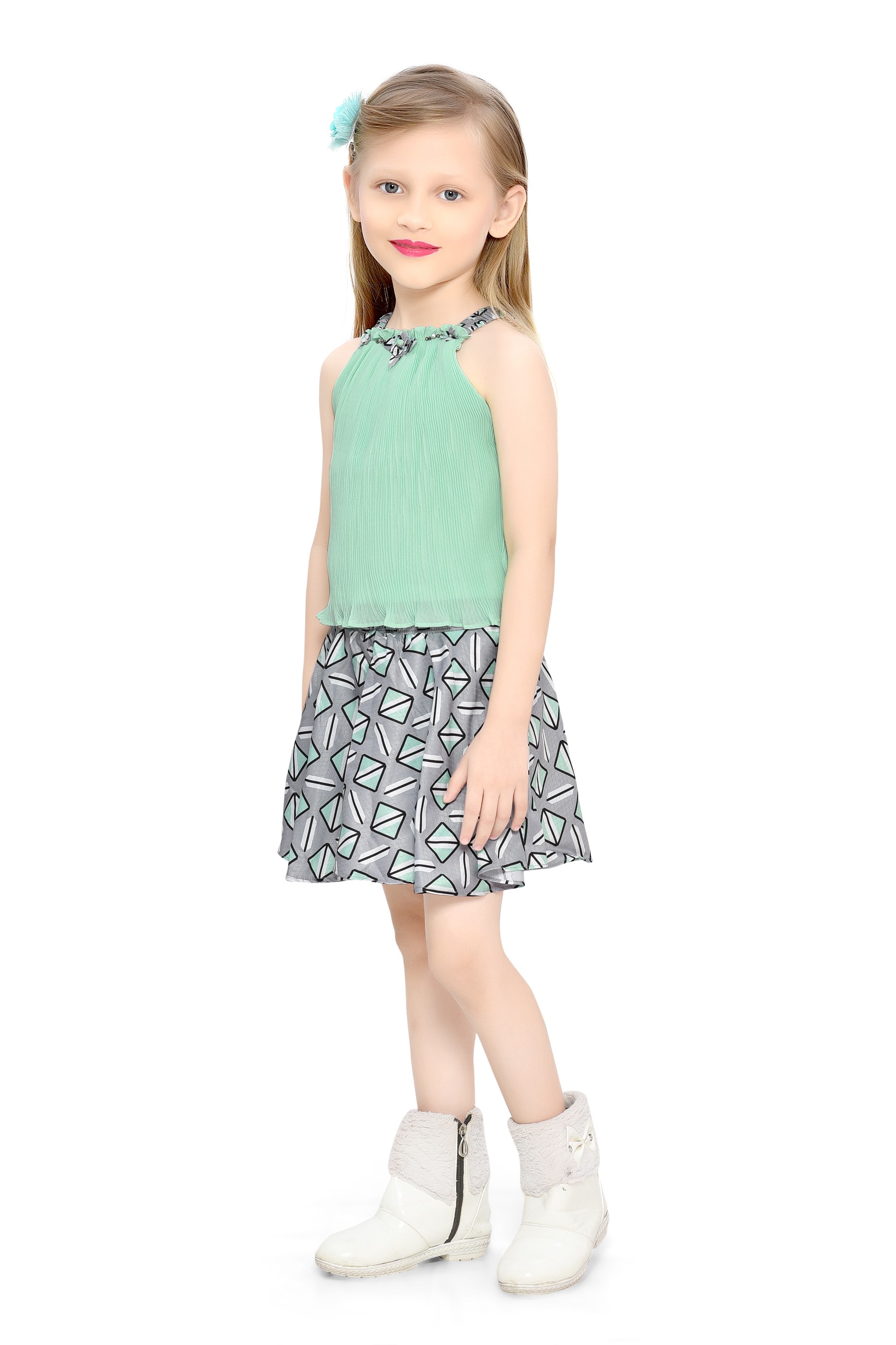 - Eye-Catching Geometric Skirt: The skater skirt features a bold geometric pattern in shades of green, adding a pop of color and character to the outfit.