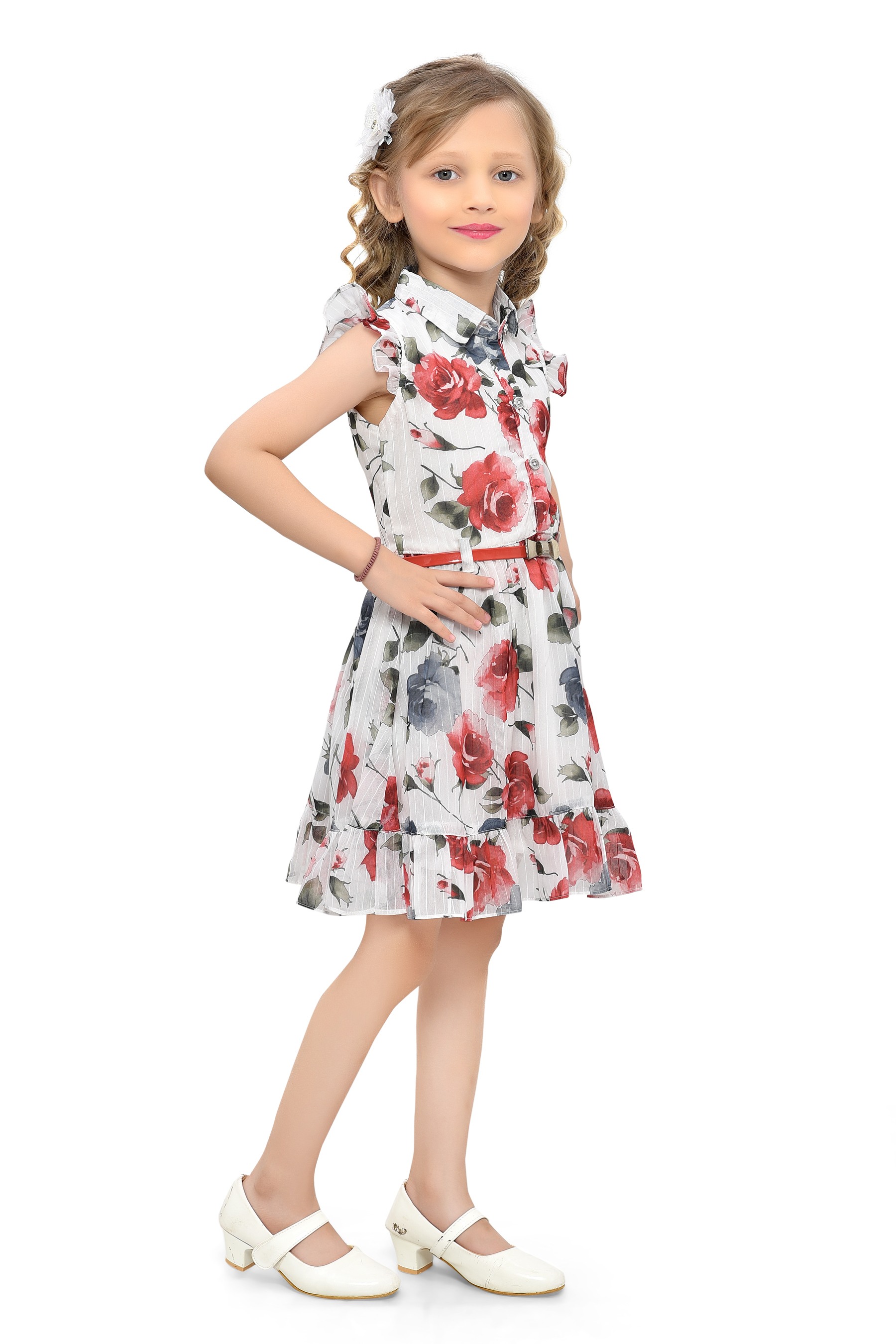 Introduce a burst of floral freshness to your little girl's wardrobe with the Be:Kids Floral Print Pleated Dress. This charming dress is adorned with a lively red and blue floral print set against a pure white background, evoking the joy and beauty of blooming gardens.