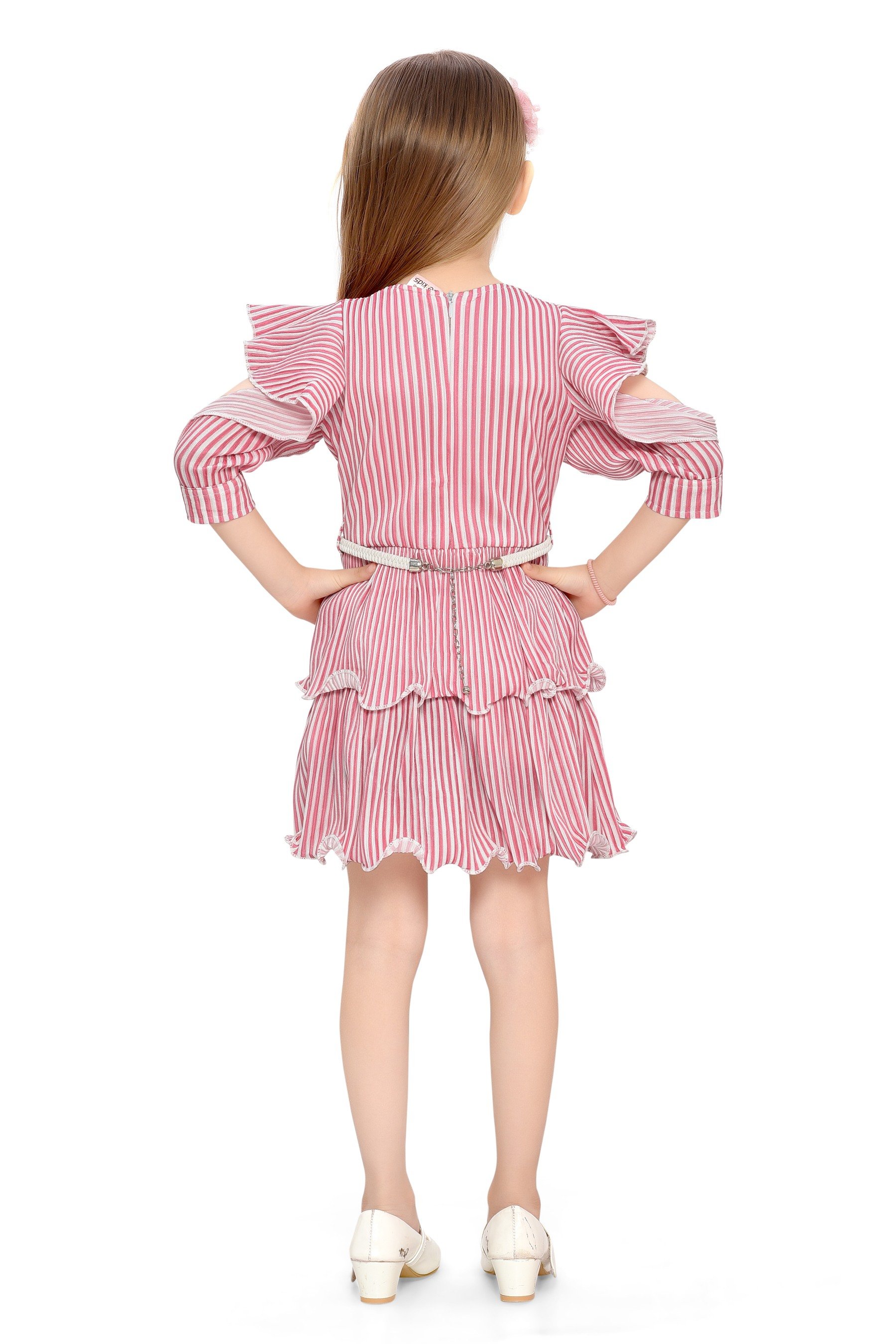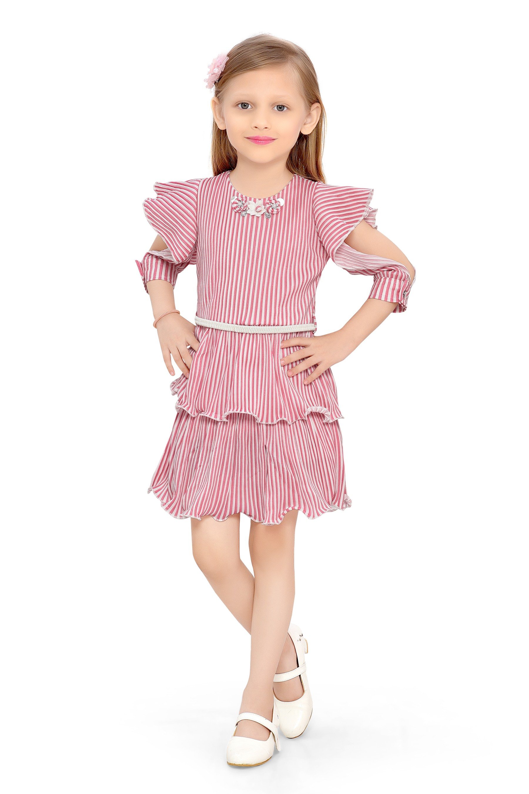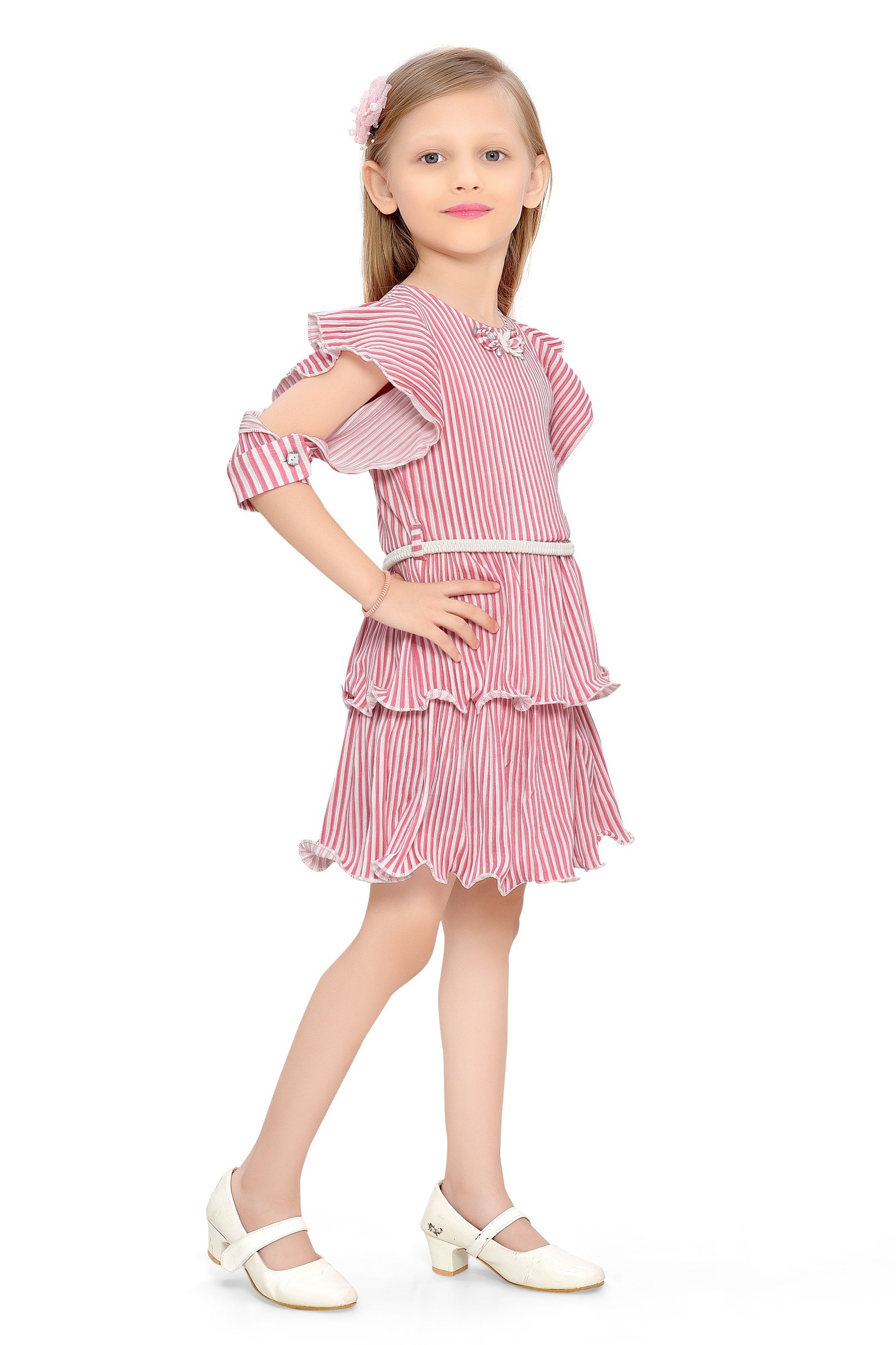 Dress your little girl in the Be:Kids Girls' Playful Pink Striped Ruffle Dress, a charming and vibrant addition to her wardrobe that's perfect for any sunny day out or special occasion.