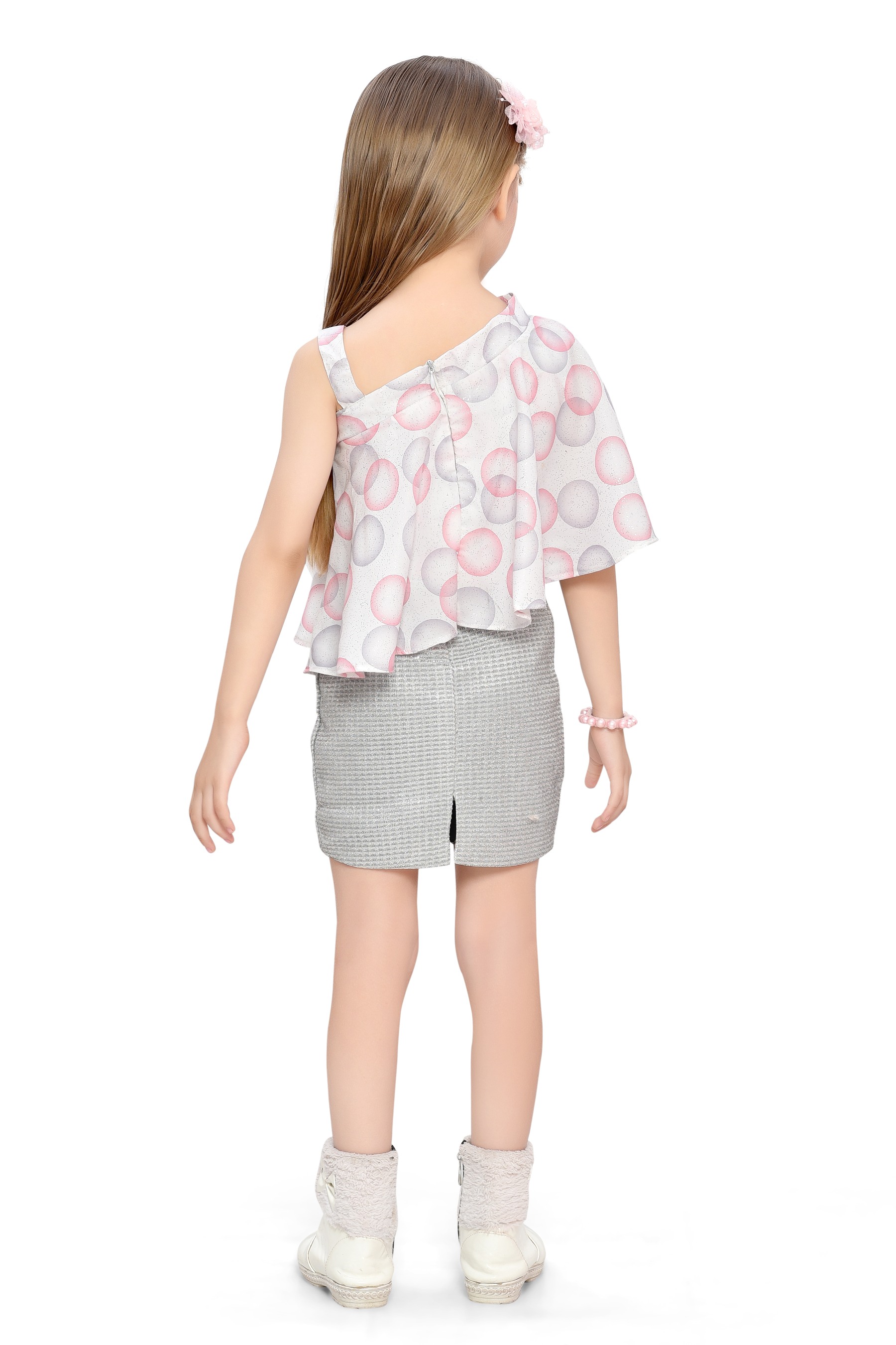 - Unique Asymmetrical Top: The one-shoulder asymmetrical top is adorned with a charming balloon print, adding a touch of whimsy to the overall design.