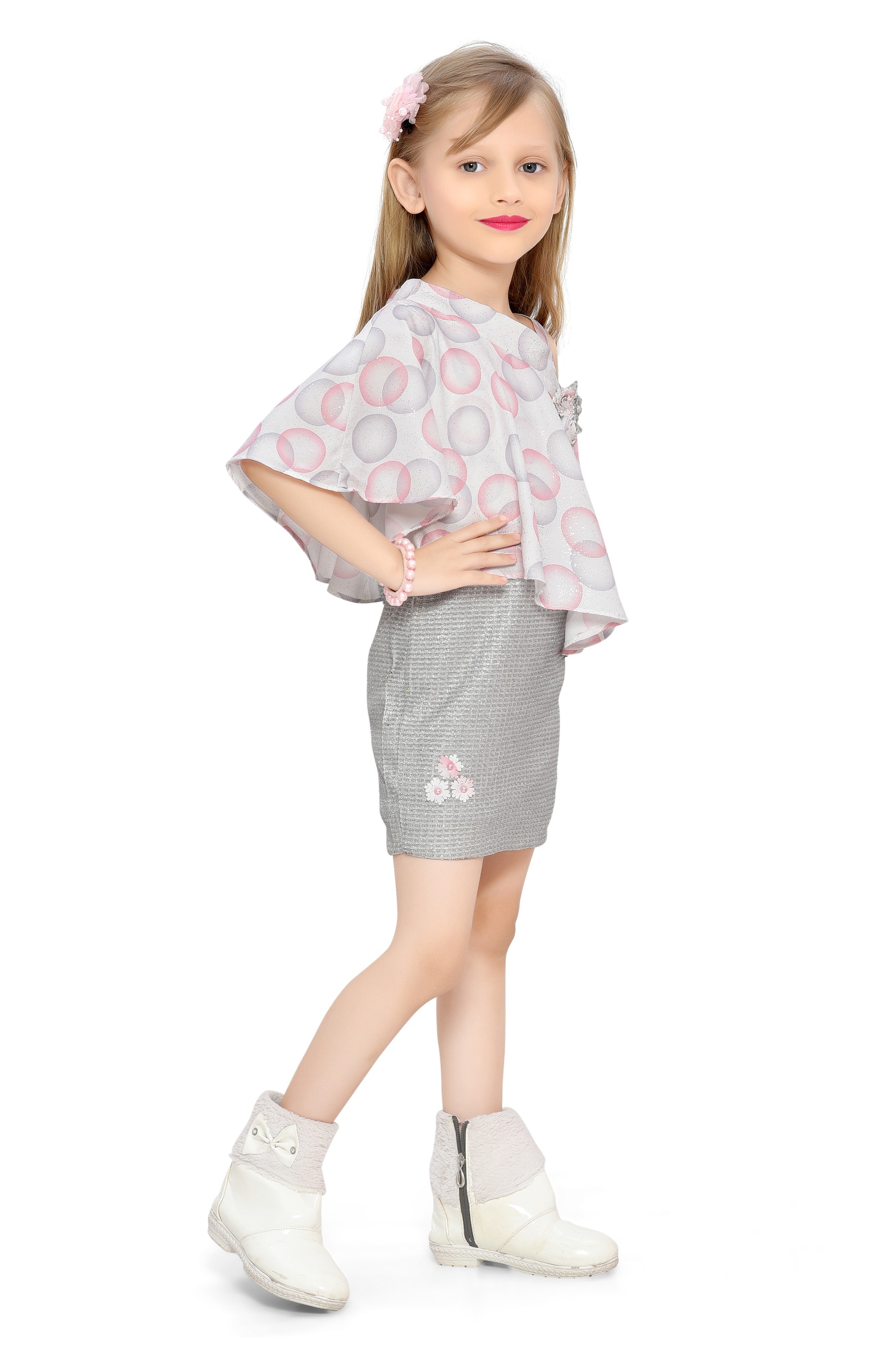 - Coordinated Textured Bottom: The attached skirt portion boasts a textured silver fabric that complements the soft colors of the top, giving the dress a cohesive and stylish look.