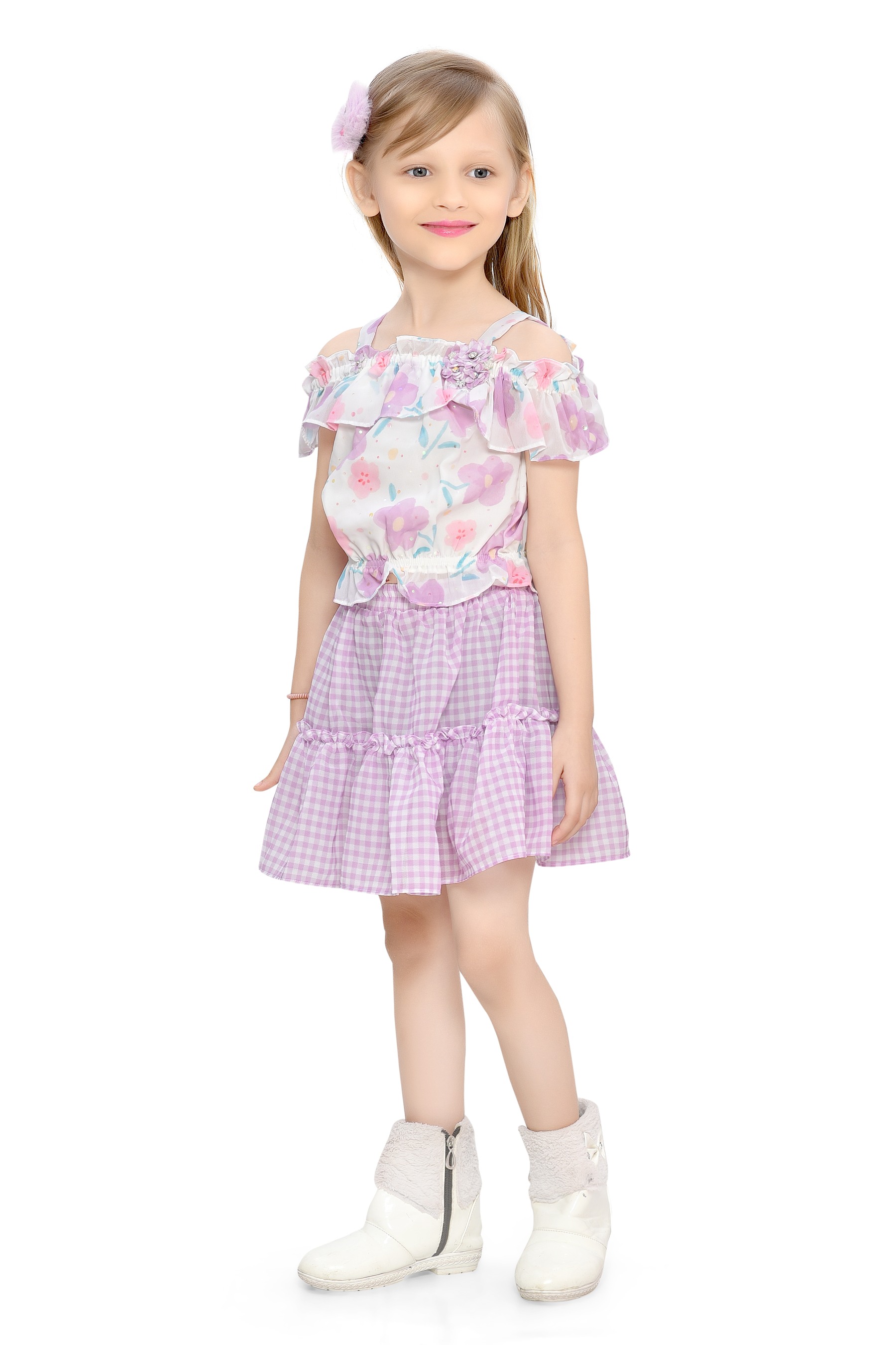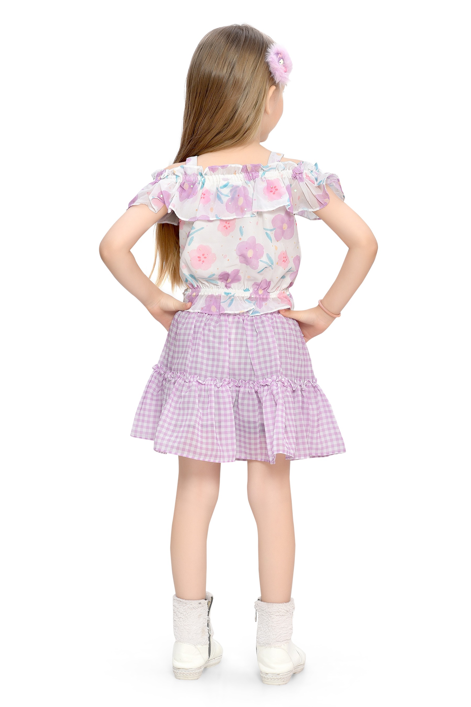 - purple Gingham Skirt: The skirt's purple and white gingham pattern provides a timeless appeal, while the ruffled hem adds a fun, girly flair.