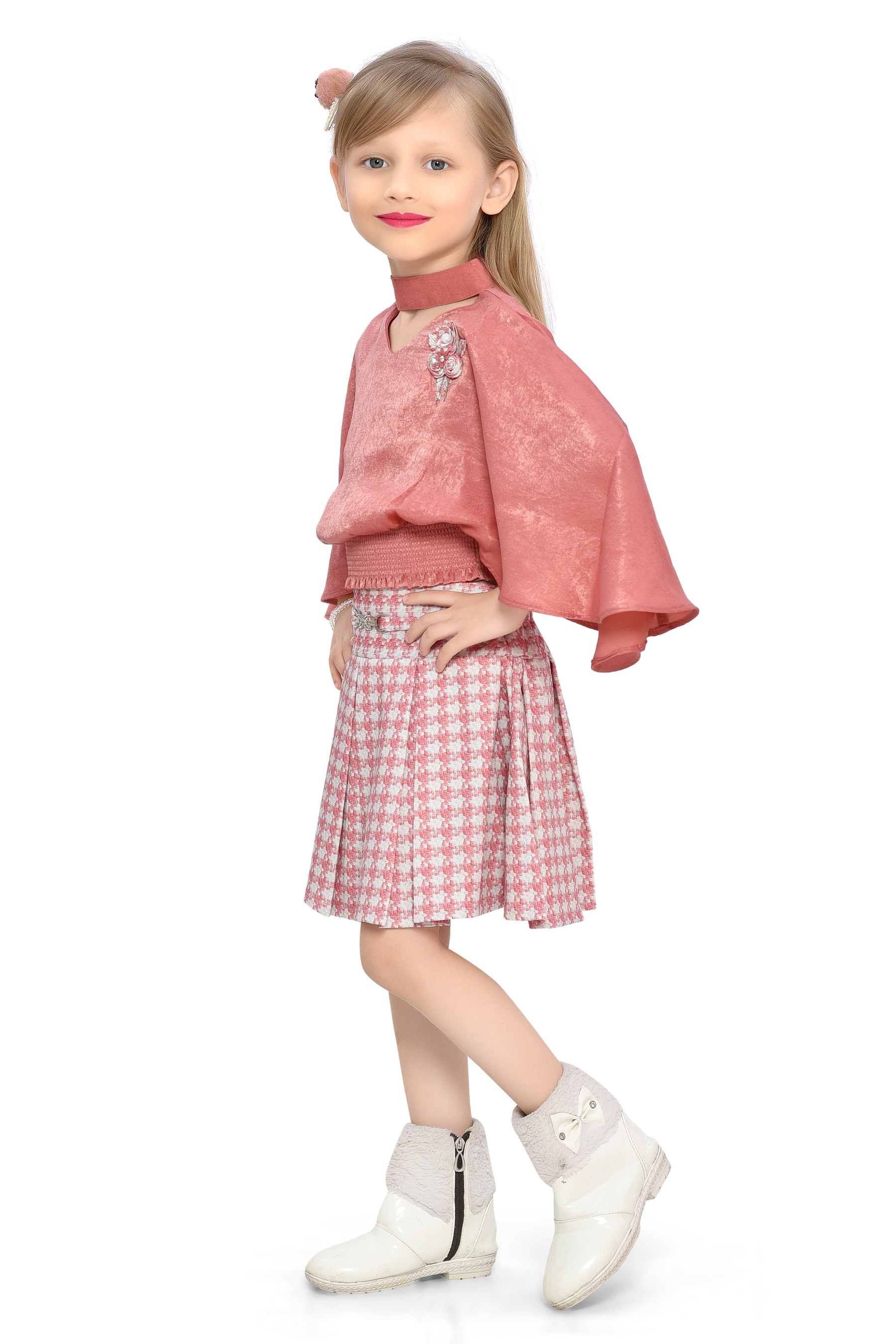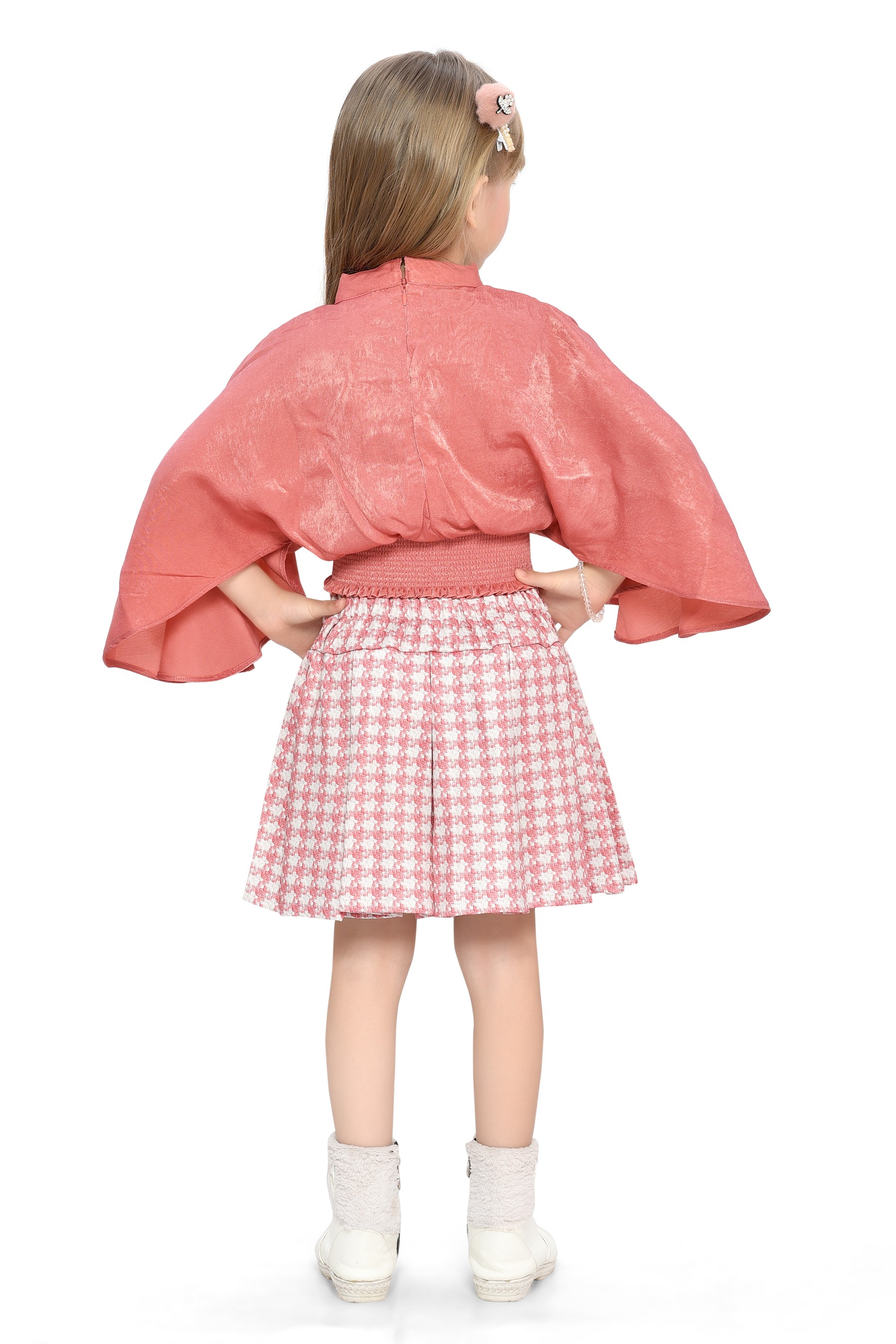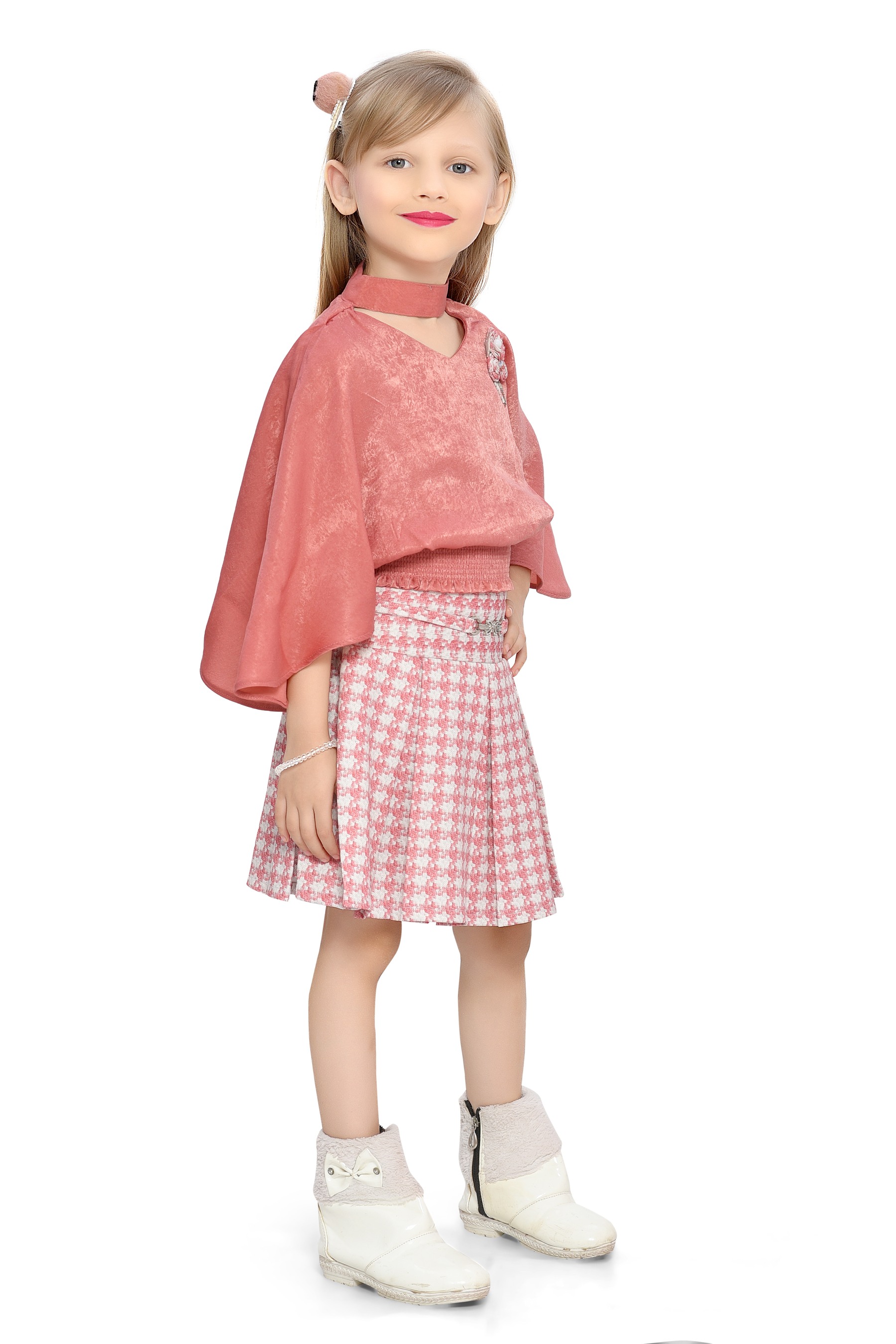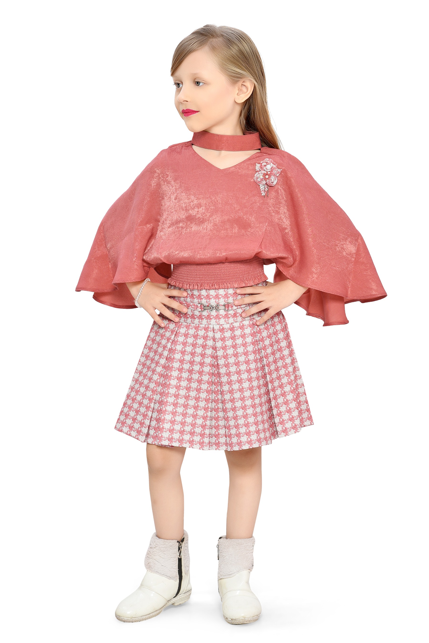 Embrace the essence of fall fashion with the Be:kids Autumn Charm Girls' Ensemble, a delightful combination of a luxurious velvet poncho top in a warm terracotta shade and a classic houndstooth pleated skirt. This outfit is designed to provide a stylish and comfortable option for your little one's seasonal wardrobe.
