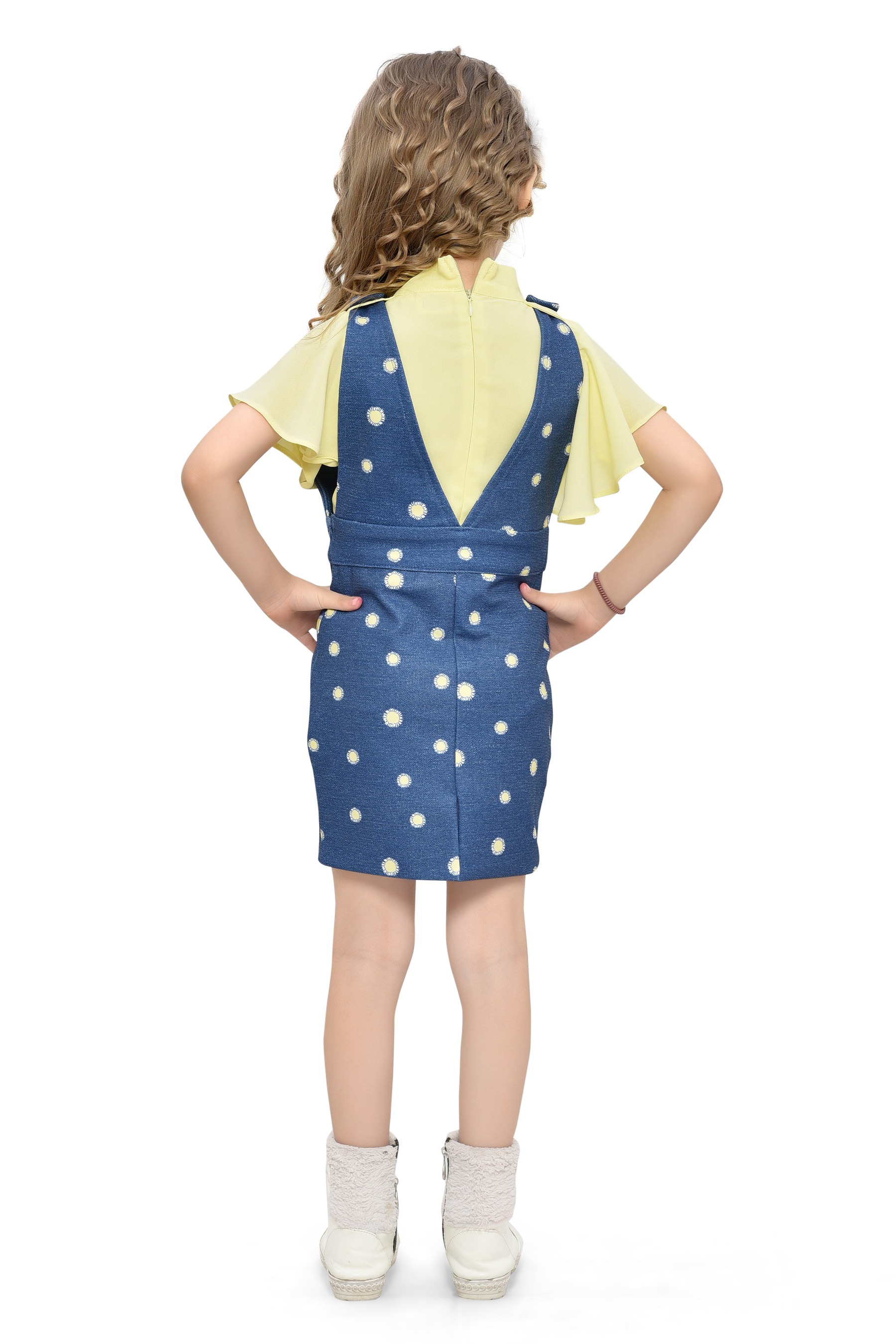 - Enchanting Polka-Dot Pinafore: This stylish pinafore boasts a delightful polka-dot print on a denim-like fabric, accented with delicate floral embroidery near the hem for a magical touch.