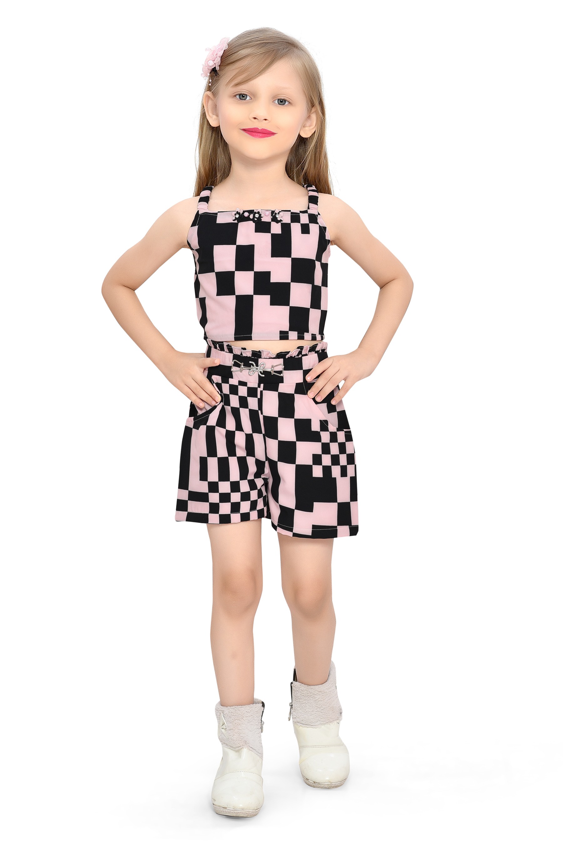 Introduce a playful yet fashionable addition to your little girl's wardrobe with our Chic Checkerboard Girls' Two-Piece Outfit. This charming set features a sleeveless top and coordinating shorts, both adorned with a trendy checkerboard pattern that's sure to turn heads.