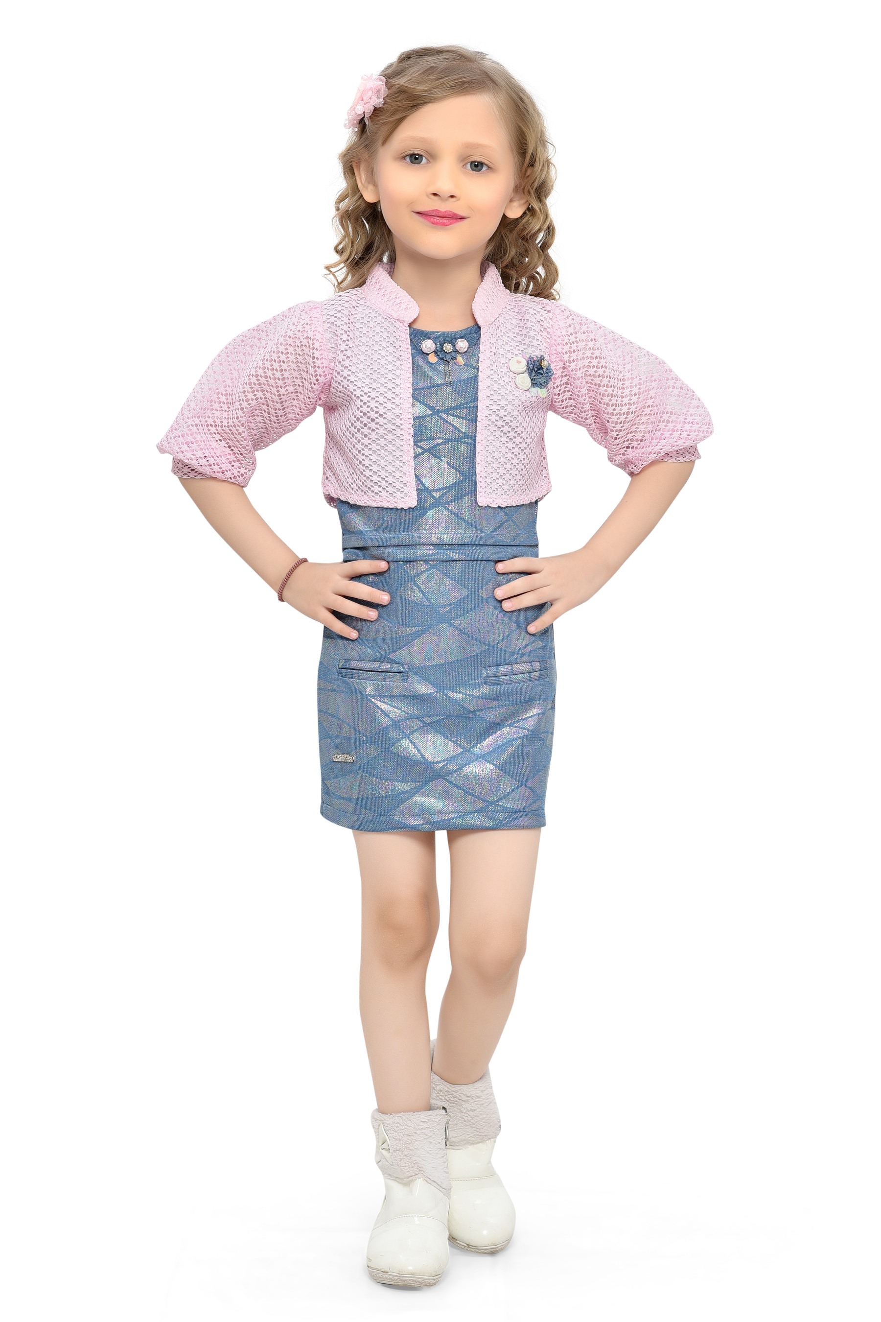 Be:Kids Chic Blossom Girls' Shimmering Blue Geometric Dress with Pink Crochet Shrug Set